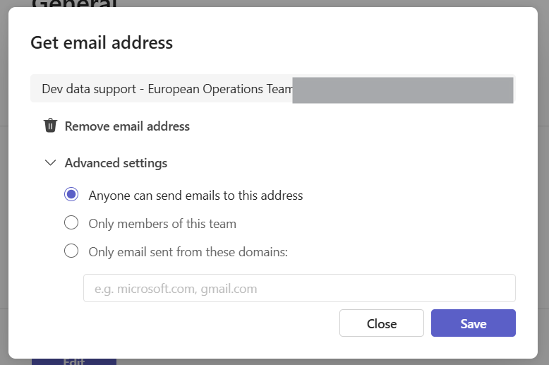 2. In the Get email address dialog of Microsoft Teams, expand Advanced settings.