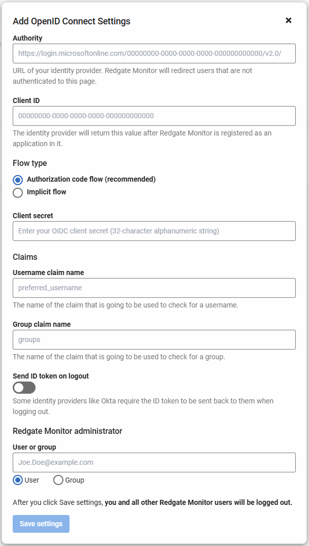 - Click Save settings. Redgate Monitor logs you and all other users out.