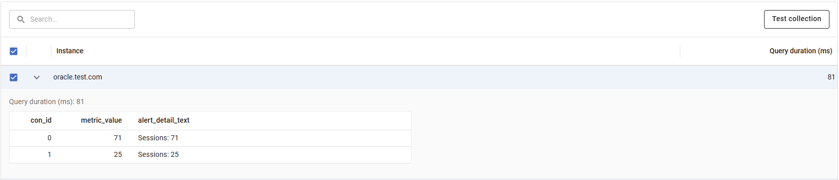 For Oracle, each row can be expanded to see the returned results in a table with columns: con_id, metric_value, and alert_detail_text (if present). If the query failed, the row expands to show the error message instead.