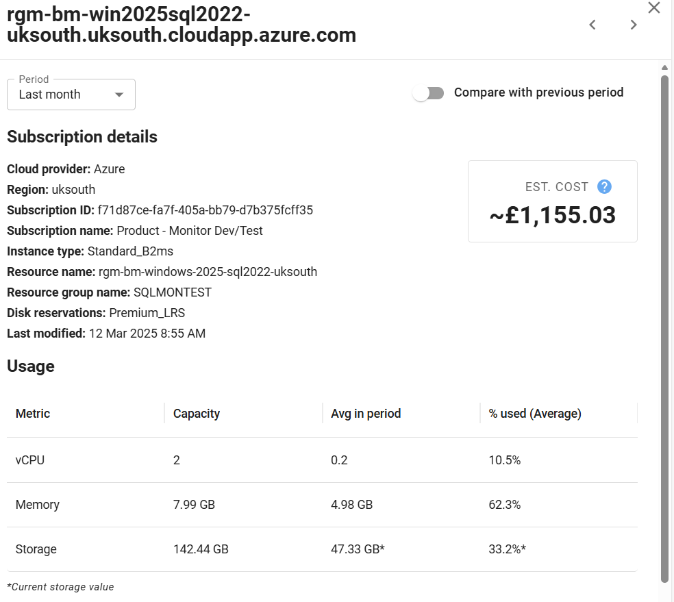 Subscription Details and Estimated Cost (for VMs hosted in supported cloud providers, and where Monitor has been provided access to those details. See Managing cloud services for further information)