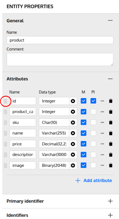 To copy some attributes from one entity to another, open the Attributes section in the right panel for the first entity, and click on the dragging button to select a column. You may select a few of the attributes by using Ctrl (Cmd) and or Shift keys.