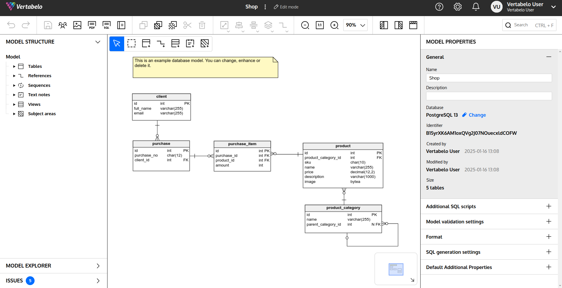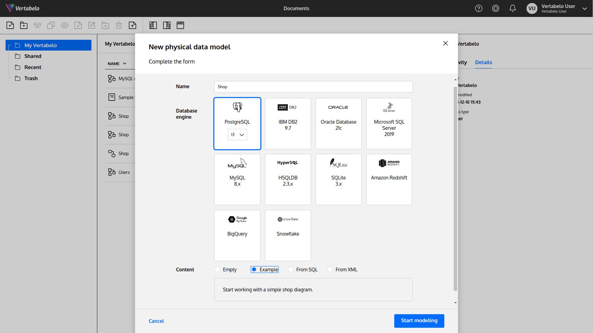 Enter the model name and set the database engine (in this article, we use PostgreSQL 13). You can create an empty model, import SQL code, Redgate Data Modeler XML or use an example project. For this tutorial, let's use the 'Example'.