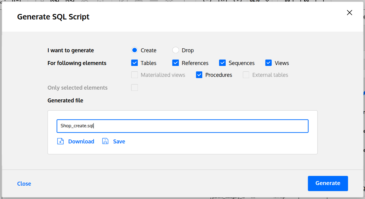 Click on the 'Generate' button to prepare SQL output. Now you can click on the 'Download' button to grab a copy or 'Save' to save this file within your account.