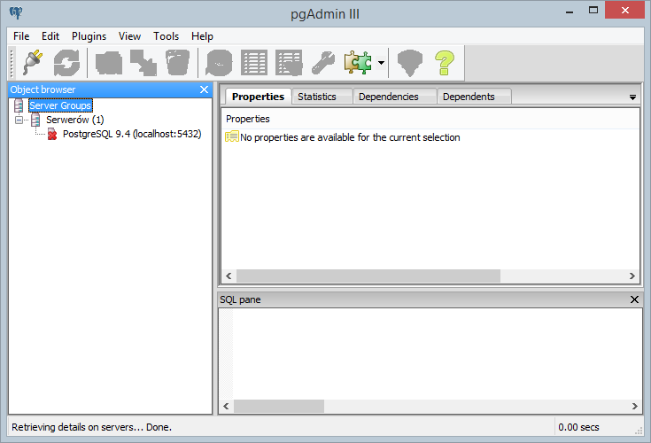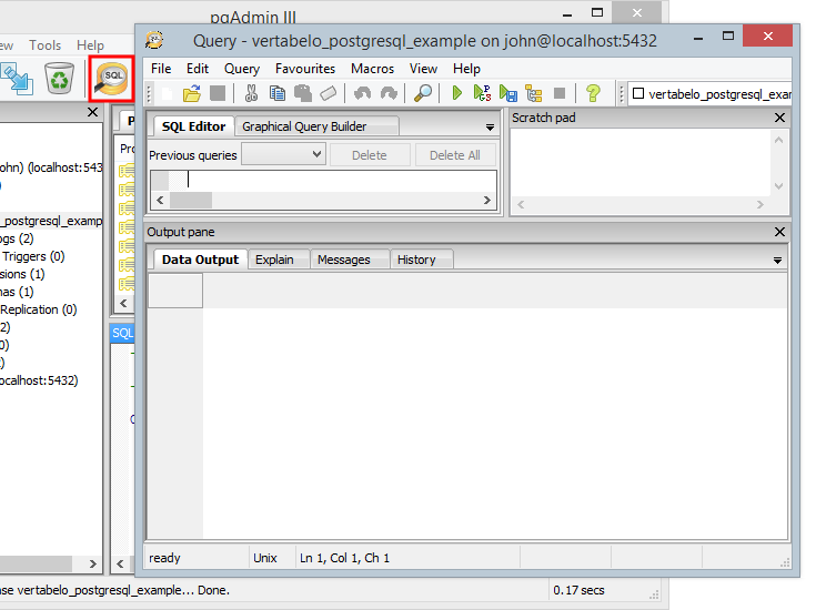 Frames in the right will list various properties. It's time to create tables. To do so, click the 'SQL Query Tool' icon. A new window appears.
