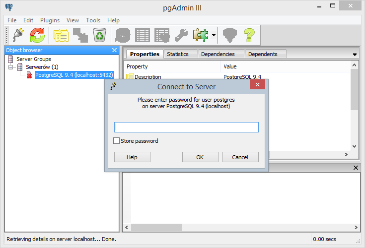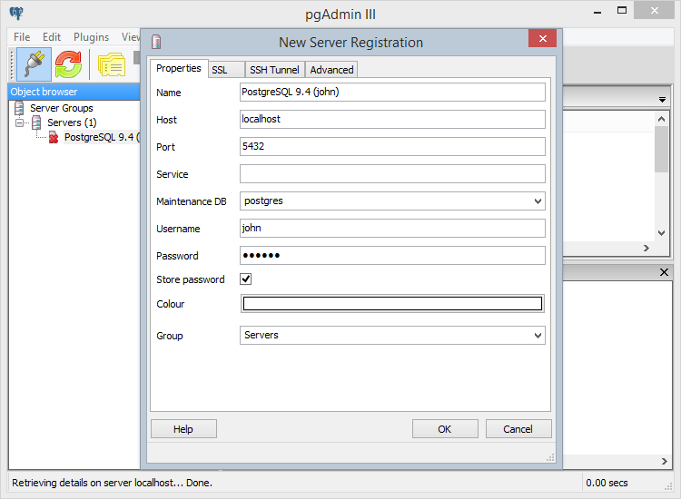 Use connection details as you did in the previous entry (right-click on PostgreSQL 9.4 and choose 'Properties' to see them), set username to john and enter the password. Click OK to confirm.