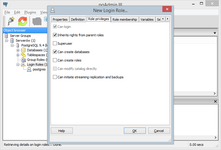 The next thing is to create a new role. A role is a concept working like a user or a group in a database. Choose 'New login role...' from the context menu of 'Login roles' (right mouse button click). Fill in Properties / Role name (e.g. john), Definition / Password and select Role privileges / Can create databases.