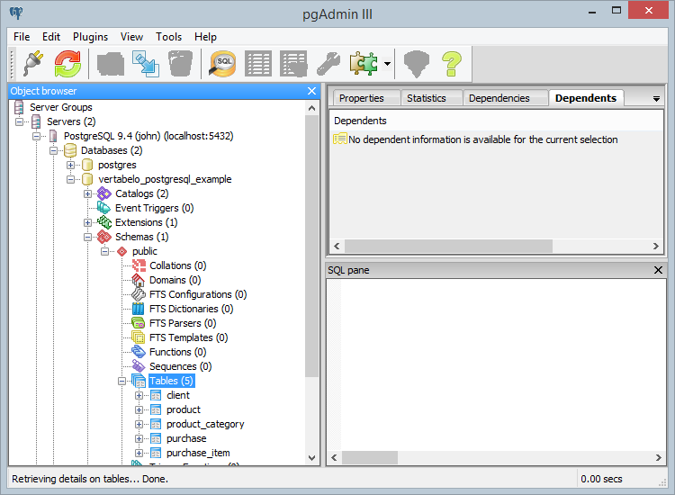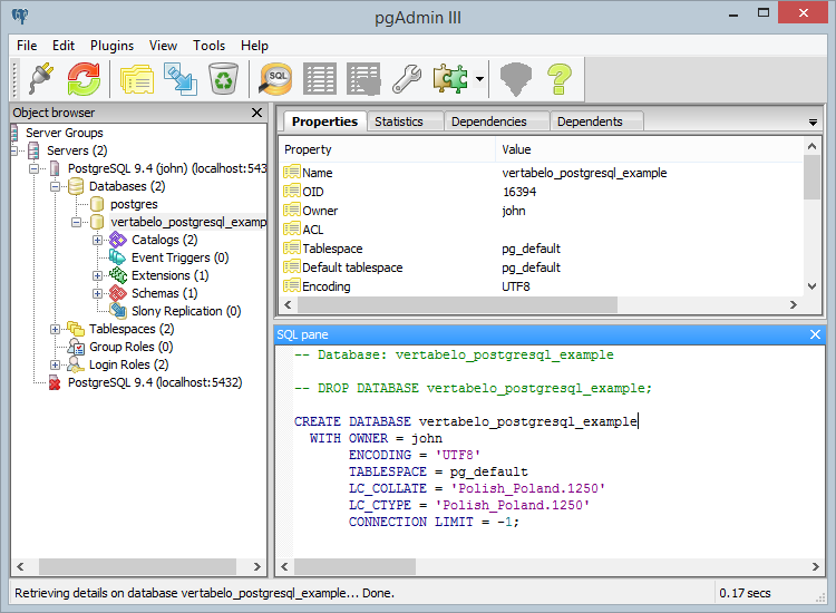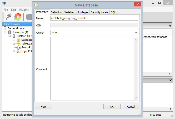 Insert database name (vertabelo_postgresql_example in this tutorial) and set the owner to john. Click 'OK' and disconnect from the current server.
