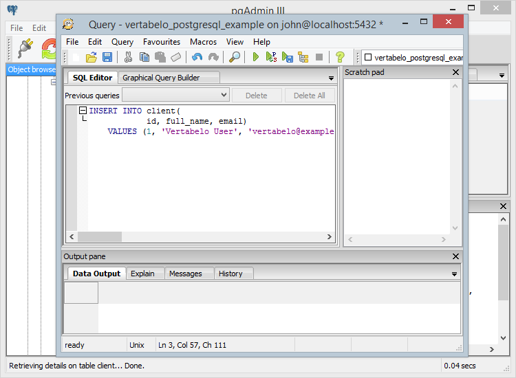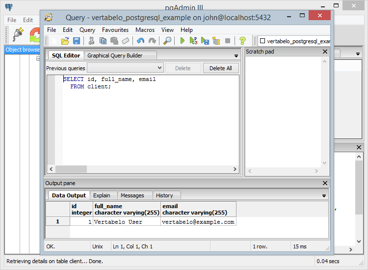 vertabelo_postgresql_example=> SELECT * FROM client; id | full_name | email ----+----------------+----------------------- 1 | Vertabelo User | vertabelo@example.com (1 row)