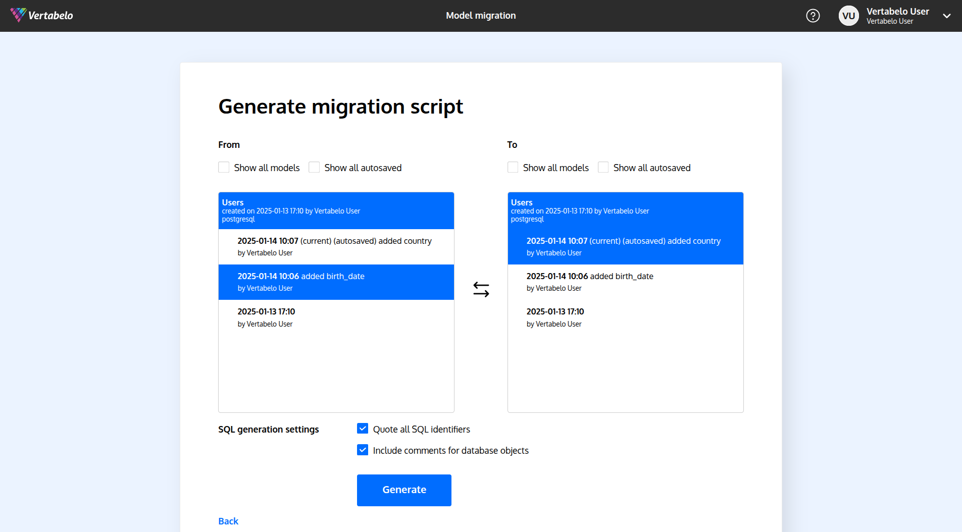 In the Versions tab select a version you want to create a migration script from, and from its drop-down menu select Generate migration from this version.