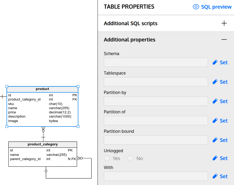 Select a table or view, and then expand "Additional properties" in the right panel: