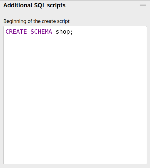 If you would like to add a clause creating a schema, you can do this in "Additional SQL scripts".