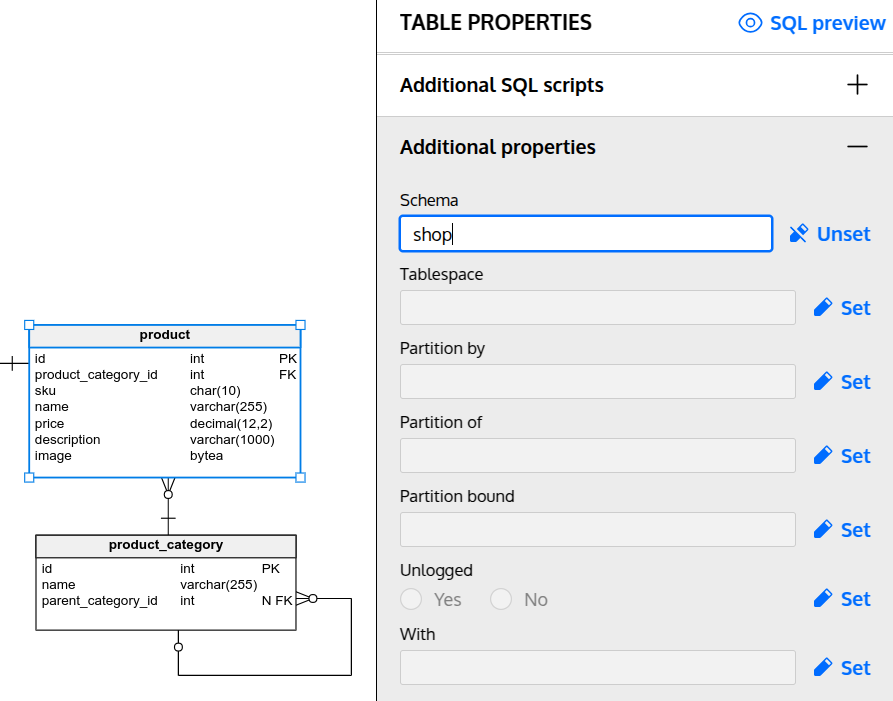 Then set the schema name in the "Schema" field separately for each object to be included within this particular schema, e.g.:
