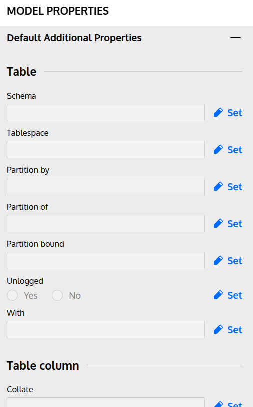 You can also define a specific schema name for all new tables or views to be created within your model. To do so, go to the Model Properties (right) panel (make sure, you haven't selected anything), and scroll all the way down to the Default Additional Properties tab. There are more properties to set there, so make sure you take a look at it:
