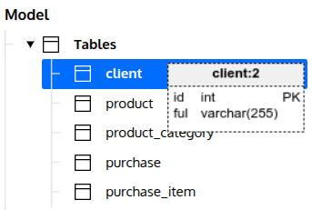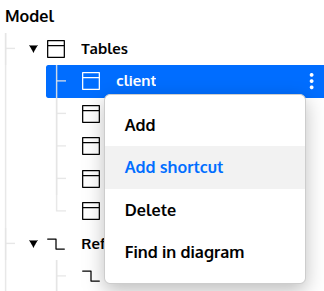 Let’s try to do exactly the same thing like we did above – creating two different subject areas containing the purchase table, but now using shortcuts. Begin by adding one shortcut for client, one for purchase_item and two for purchase. This can be done by clicking the Add shortcut under the right-click menu.