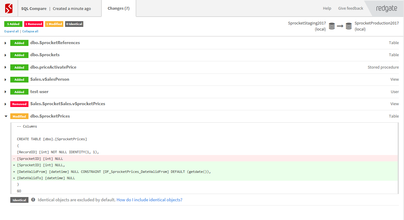 You can expand and collapse the objects in the Interactive HTML report. By clicking an object you can view the differences in the object creation scripts.