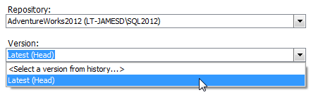 - In the Repository box, select a database linked to SQL Source Control, or click <Browse source control...> to specify a repository URL.