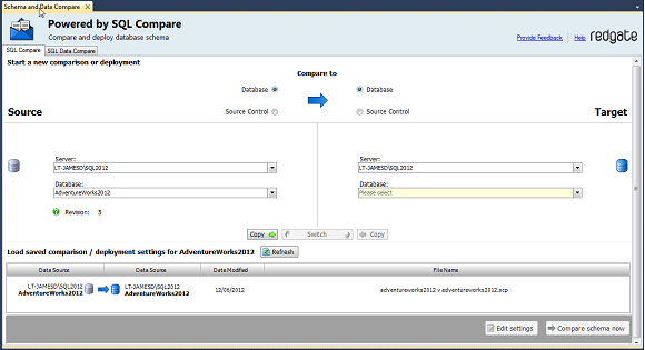 The Schema and Data Compare tab is displayed, with the database you selected set as the source in the leftmost pane: