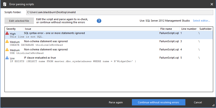 If SQL Compare encounters an error comparing a scripts folder, the Errors Parsing Scripts dialog box is displayed: