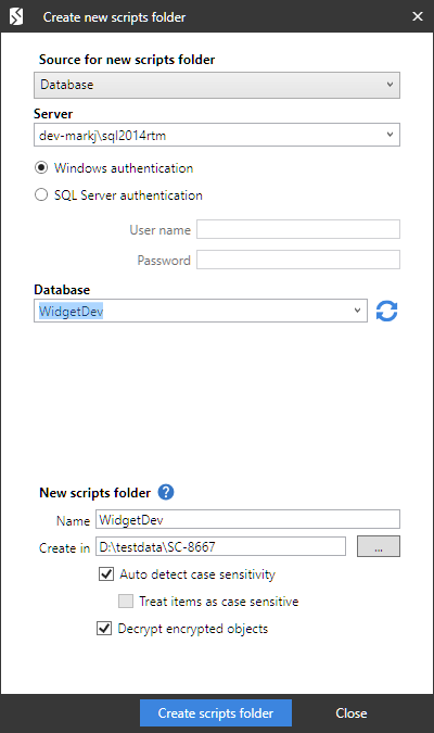 Under Data source details, specify the details of the source for the scripts folder. You can create a scripts folder from a database, backup, snapshot, or another scripts folder.