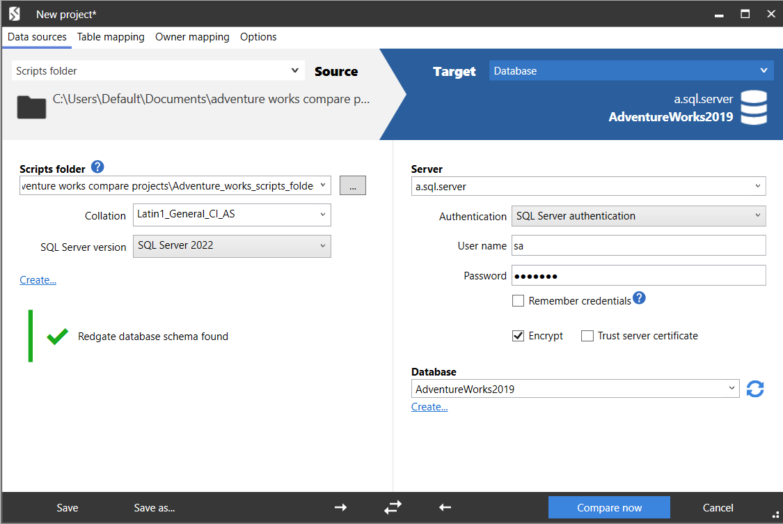 If you want SQL Compare to remember your password, select the Save password check box. - In the Database box, type or select the name of the database.