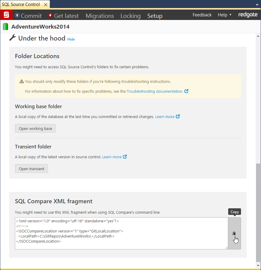 - In the SQL Source Control Setup tab for a source-controlled database, click on the Show link next to Under the hood