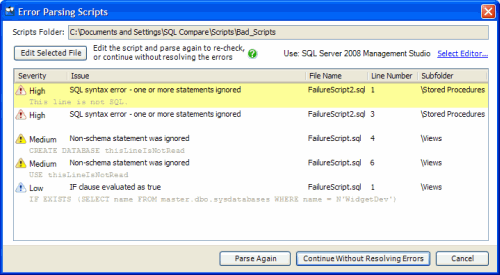 If SQL Compare encounters an error comparing a scripts folder, the Errors Parsing Scripts dialog box is displayed: