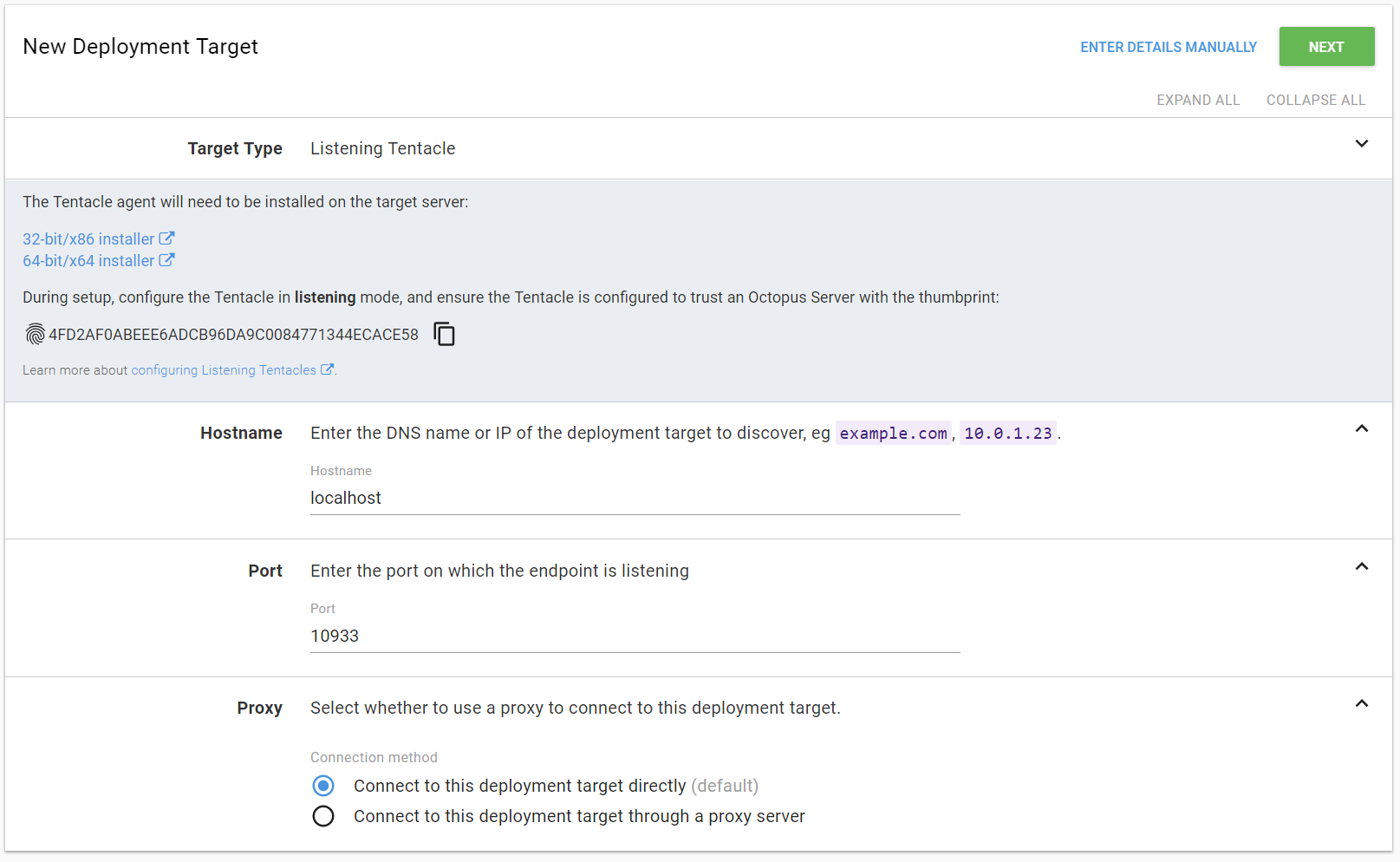 - The Tentacle is on the same machine as the Octopus Server, so it doesn't need any further configuration to establish a connection.