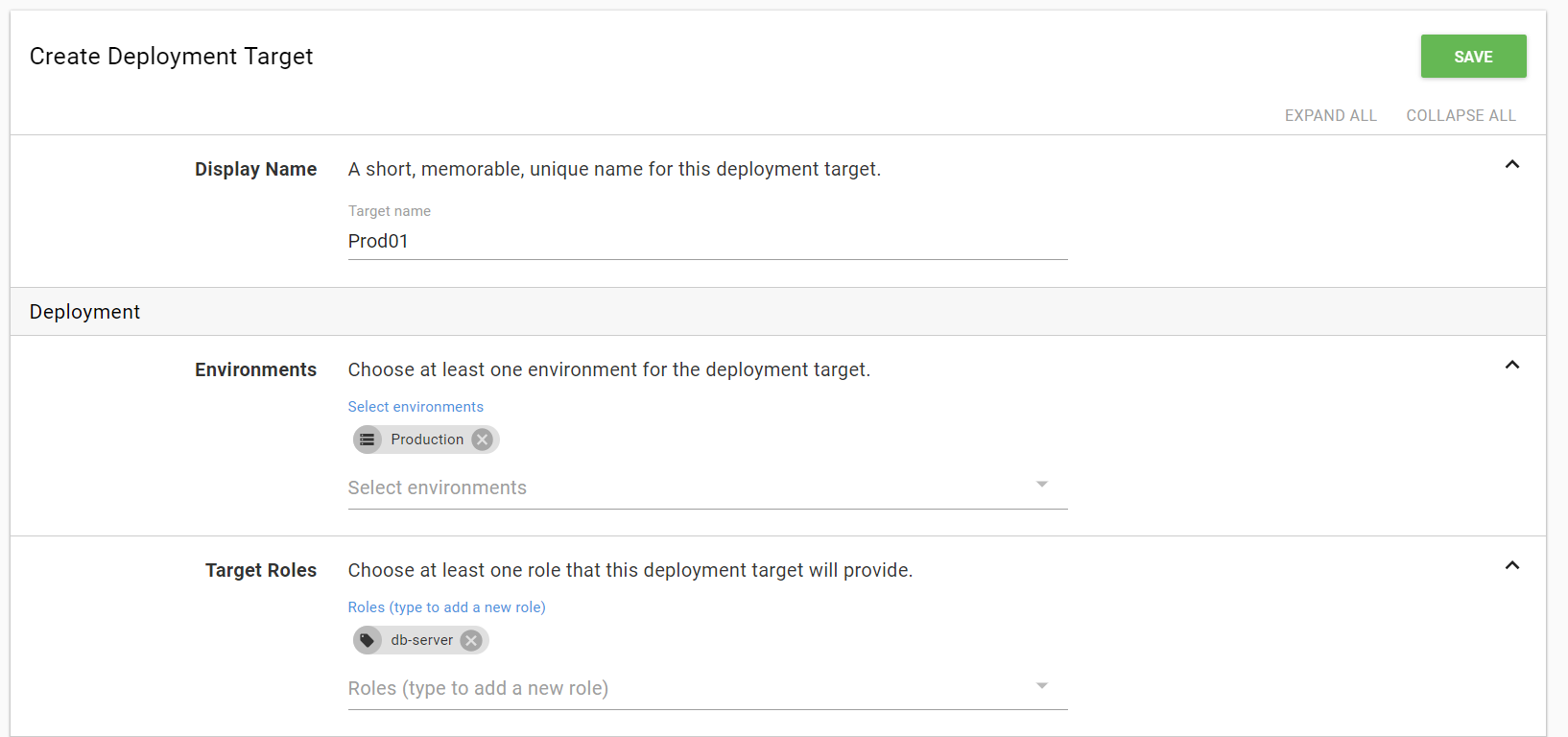 - Add a deployment target with the Display name of Prod01 and in the Roles box, type db-server and press enter: