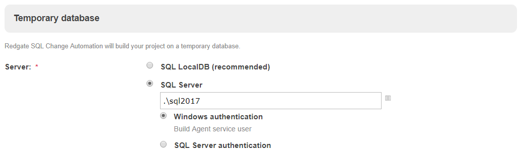 By default SQL Change Automation uses LocalDB to recreate and validate a temporary version of your database. The temporary database is dropped once the build is complete.