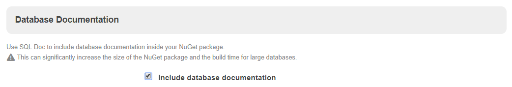 Including database documentation will increase the size of the NuGet package and the time it takes to build, particularly for large databases.