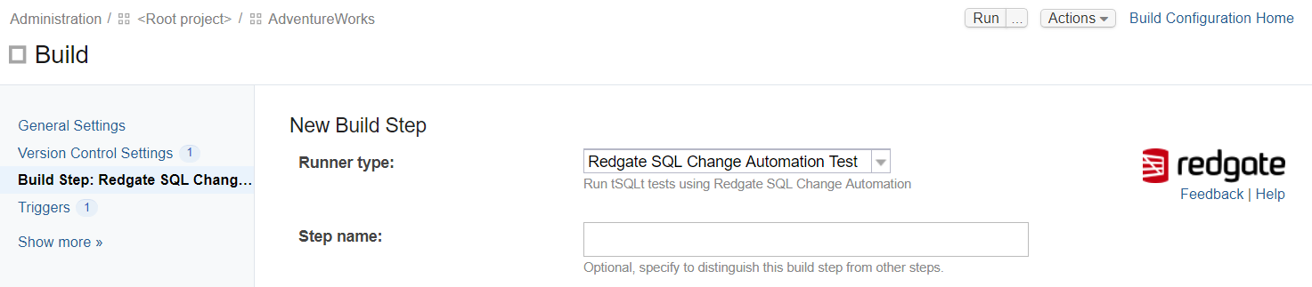 You'll add the build step using one of Redgate's build runners for TeamCity. For more information on build runners, see Configuring Build Steps.