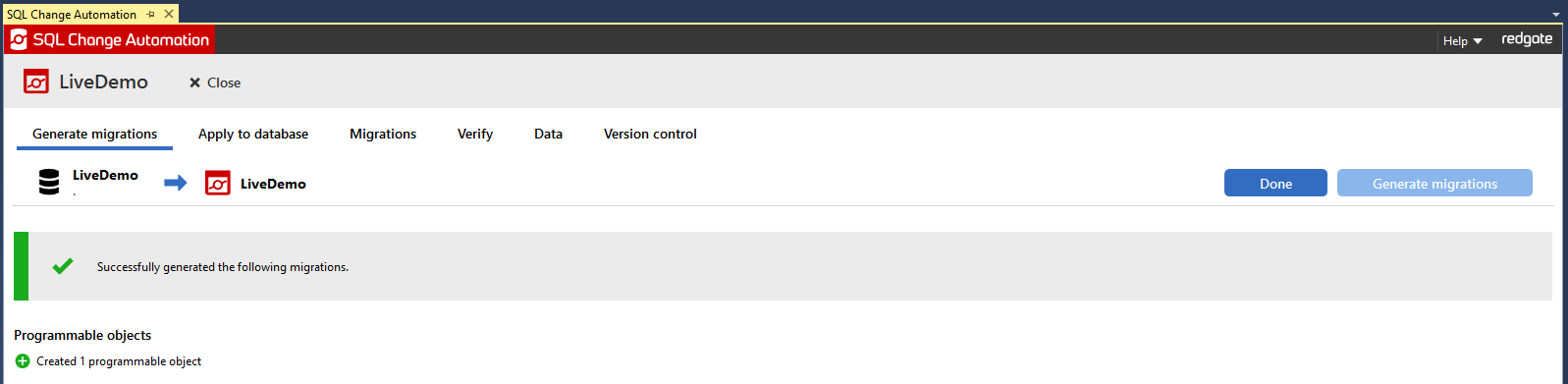 When the migrations have been generated the summary page will show. You can view and manage all generated scripts by navigating to the Migrations page.