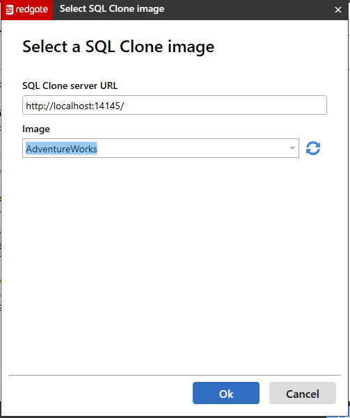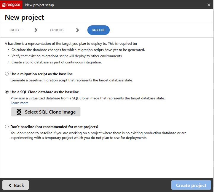 Select a valid SQL Clone server URL and SQL Clone image. Then click OK and Create project.