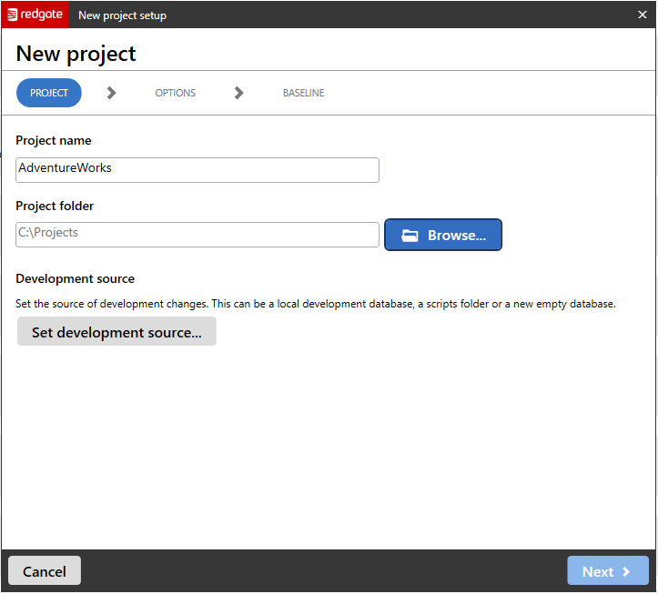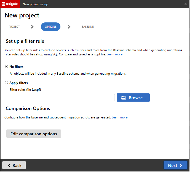 The next page will allow you to specify a SQL Compare filter file for your project or set comparison options. We’re not going to add any filters or set any custom options in this project so click Next.