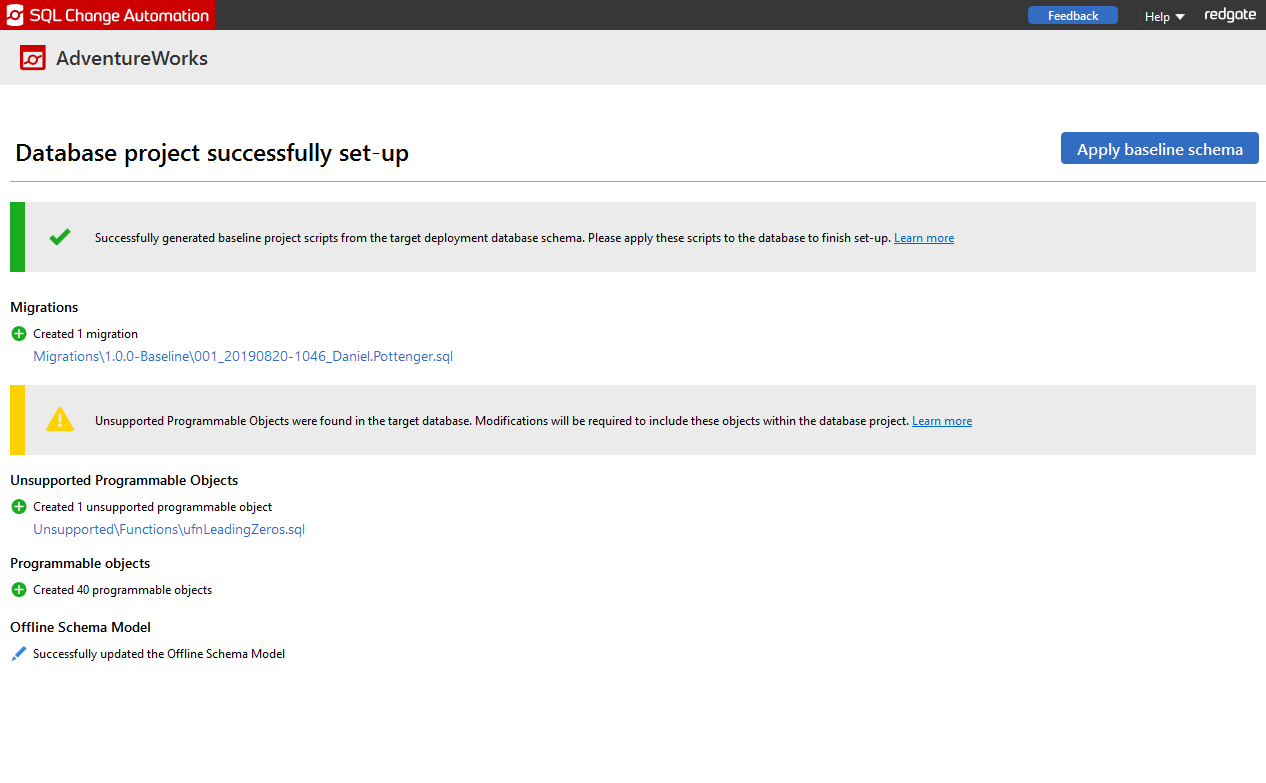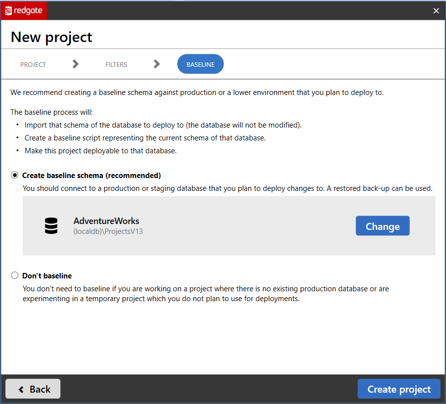 If you experience any issues applying the baseline schema (e.g. it contains invalid objects or cross database dependencies) consider using a SQL Clone image instead. Please check the full documentation for more details.