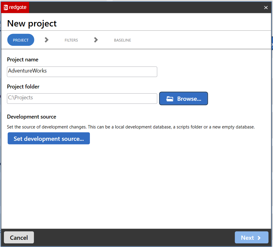 Enter a Project name and click Browse... to launch a file explorer window to choose where you want to save your project. Click Set development source… to open the datasource connection dialogue.