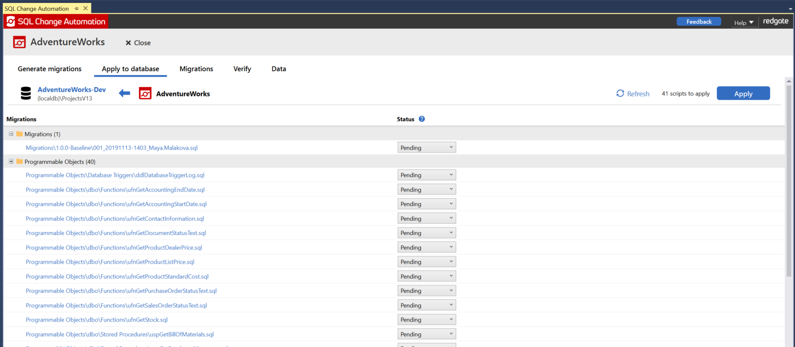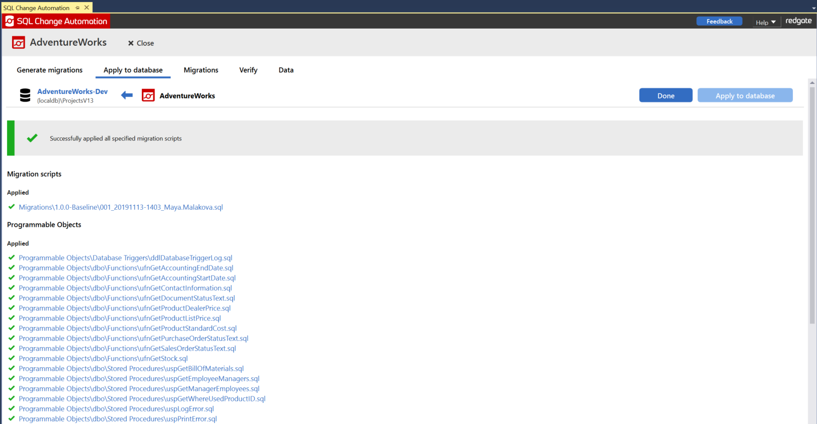 Now you can see all the scripts that have been executed on AdventureWorks_Dev as part of the baseline process. This means that AdventureWorks_Dev now reflects the schema of AdventureWorks.