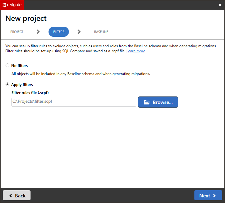 The next page will allow you to specify a SQL Compare filter file for your project. We’re going to filter out a DDL trigger from our baseline of the existing database. We have specified a SQL Compare filter file, Filter.scpf. Import this filter file by clicking the Apply filters button, and click Browse... to launch a file explorer window.
