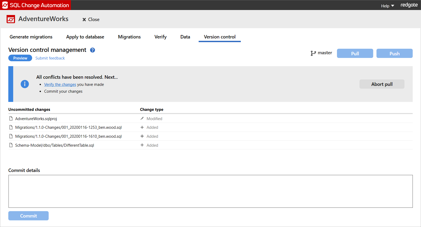 After all conflicts are resolved it is recommended that you Verify your changes to check that the project still builds successfully. In some scenarios, you may still need to make additional changes in order for the project to build (e.g. a merged migration may have modified an object used in a later migration). When you are happy with all the changes, you can commit your resolution to the conflicts. Git will create a merge commit for the changes and the merge operation will be completed.