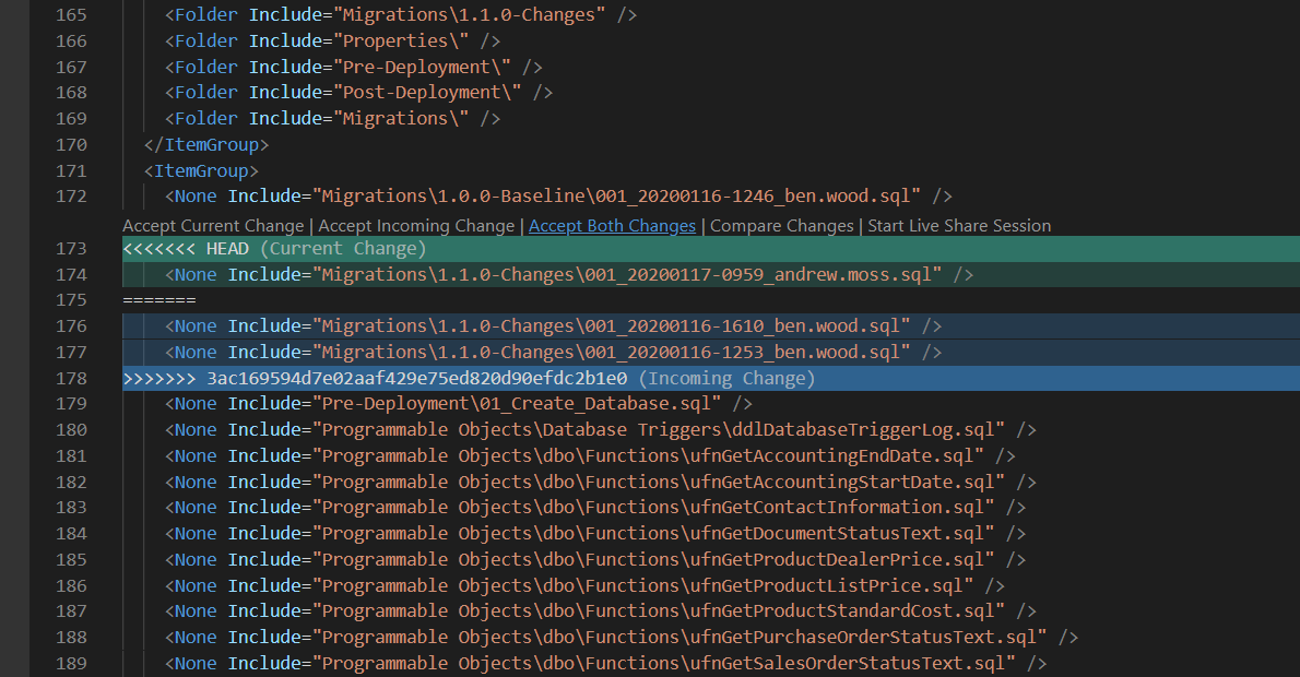 In the example above both us and a teammate have edited the project file. SQL Change Automation gives you the option at this point to either: