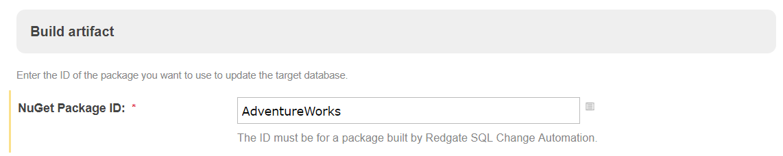 - Under Build Artifact, insert the NuGet Package ID. This must be the same ID used to configure the Build step.