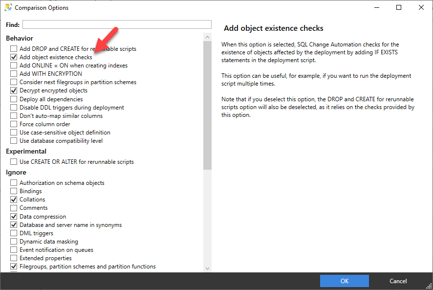 When creating a new project for a database where you are using, or plan to use Change Data Capture, it is useful to enable the comparison option for 'Add object existence checks'.