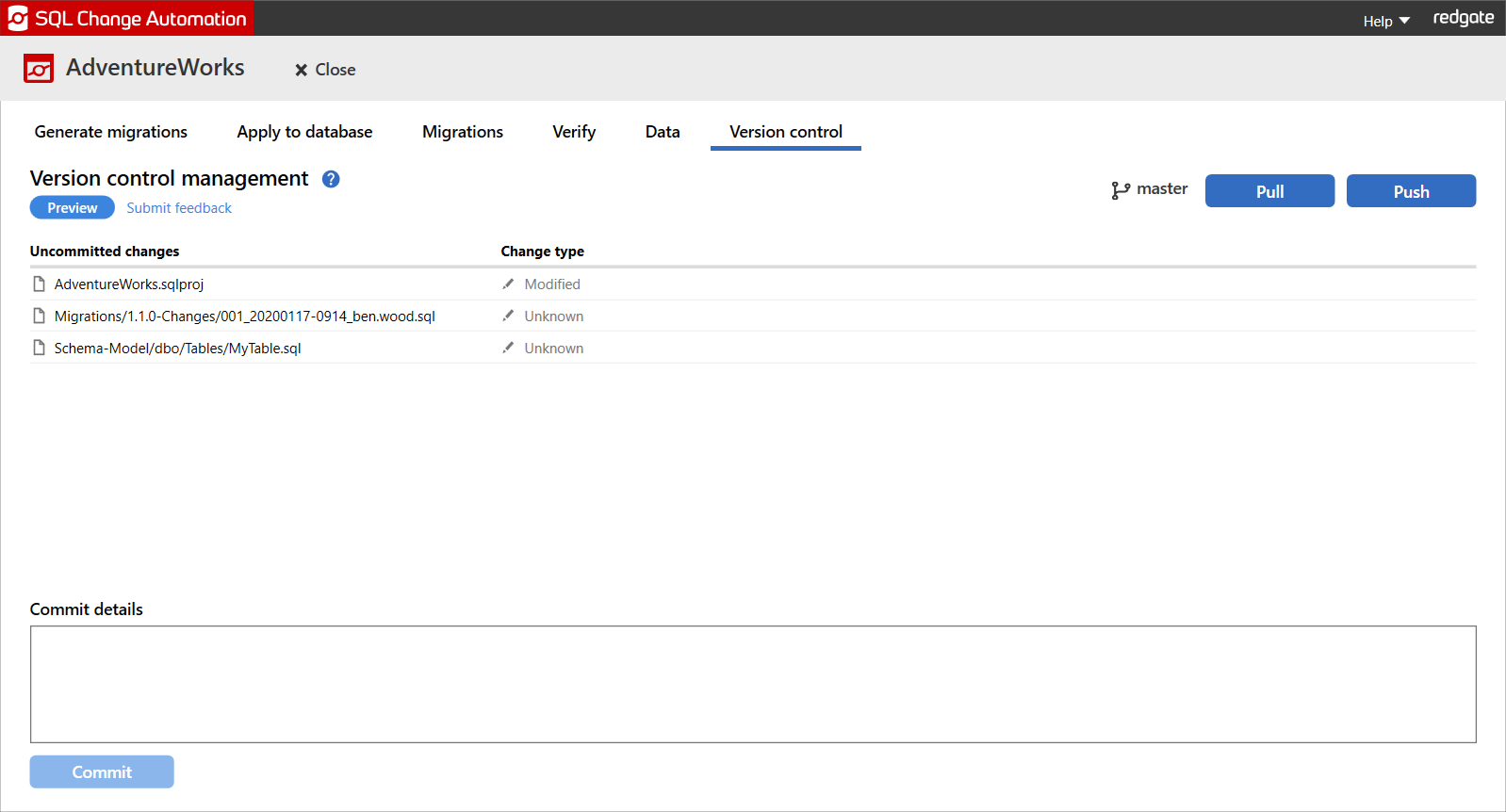SQL Change Automation helps you share your changes with the rest of your team directly from SSMS by using the Version control tab. SQL Change Automation provides integration with Git in order to help you Commit, Push and Pull changes.