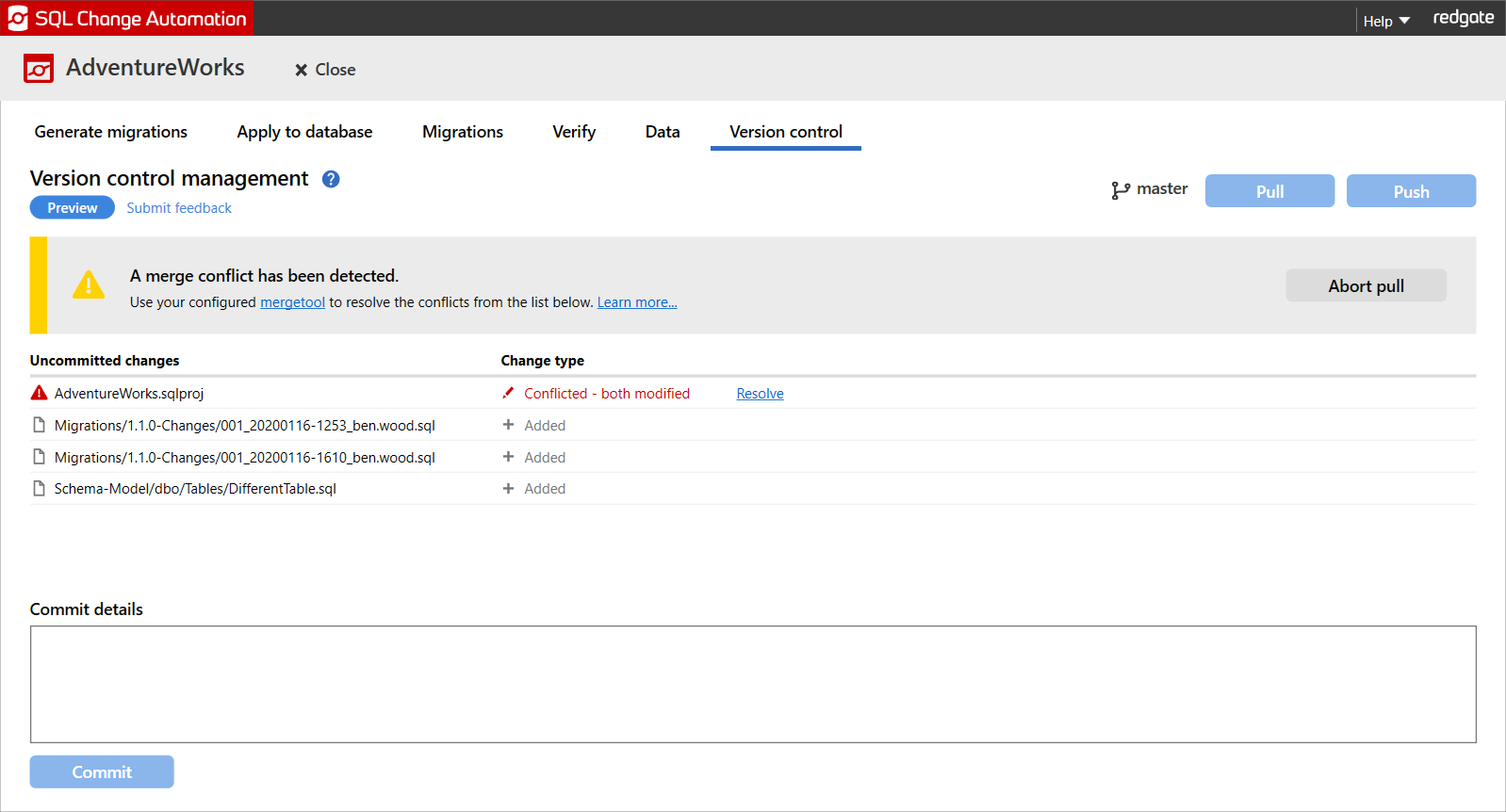 If you choose to abort the pull, then your local checkout of the repository will be rolled back to the state of the commit before you attempted to pull. If you choose to resolve the conflict in the file SQL Change Automation will open your mergetool for that file, and let you chose how to resolve the conflict.