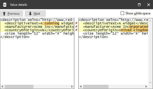 For string values, you can search the value details by right-clicking, and clicking Find. In the Find box, type your search text and click or to find the next or previous match. If there are no further matches, the Find box changes color. If the value details are displayed side-by-side, to search the value details in the other data source, click Find on this Side.