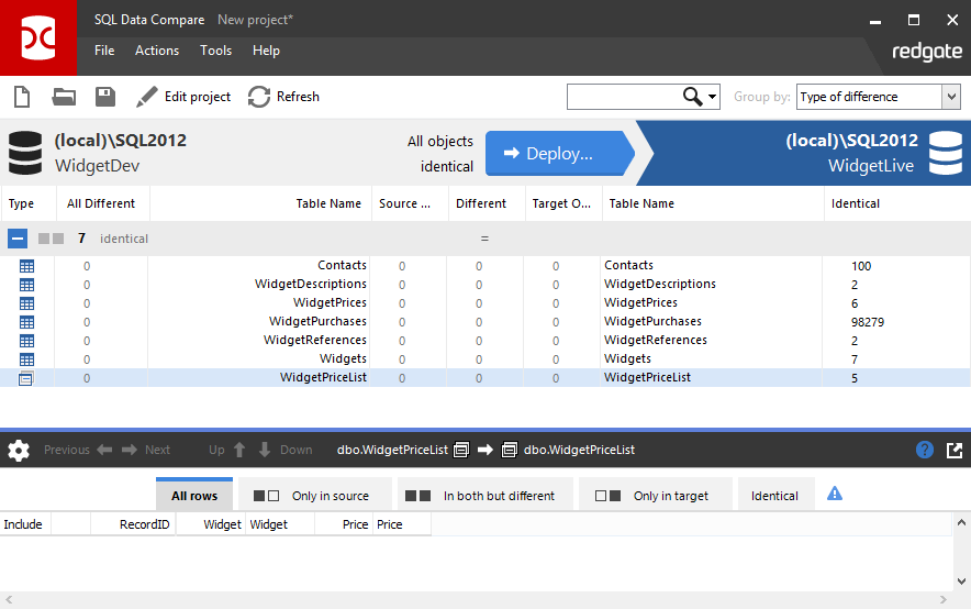 Note that the WidgetPriceList views are also now identical, because the tables that they reference have been deployed: