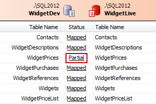 Mappings define which tables and views can be compared. For example, the table WidgetDescriptions in WidgetDev is mapped to WidgetDescriptions in WidgetLive. However, it can be mapped to any table with a sufficiently similar structure.