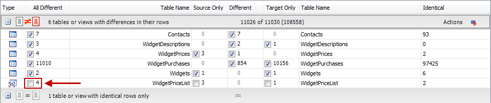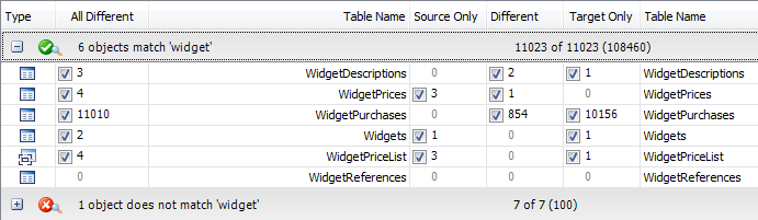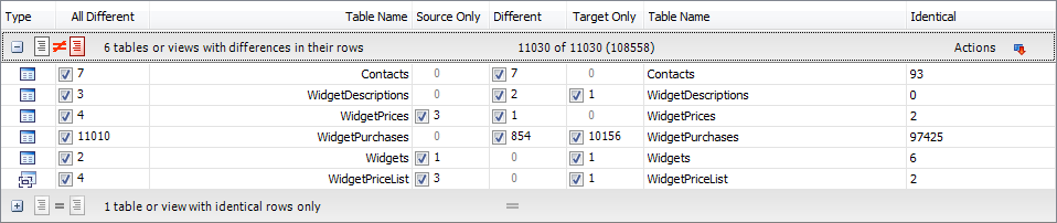 For this example, select all the tables and their rows. Make sure that the check boxes are cleared for the WidgetPriceList view. You do this by clearing the All Different check box for WidgetPriceList: