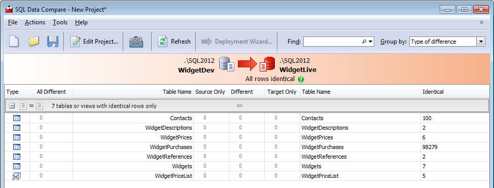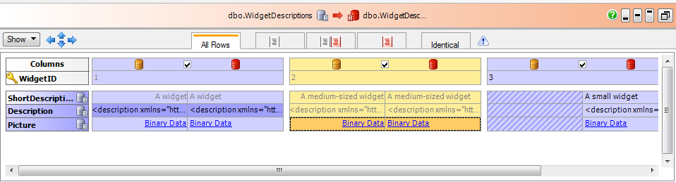 In this example WidgetID is the comparison key , used by SQL Data Compare to match rows in the two databases.
