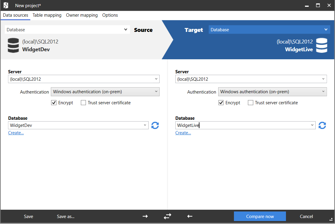 In this example, we will compare databases. You can also compare backups and scripts folders. - For each data source, in the Server box, type or select the name of the server on which you set up the databases.